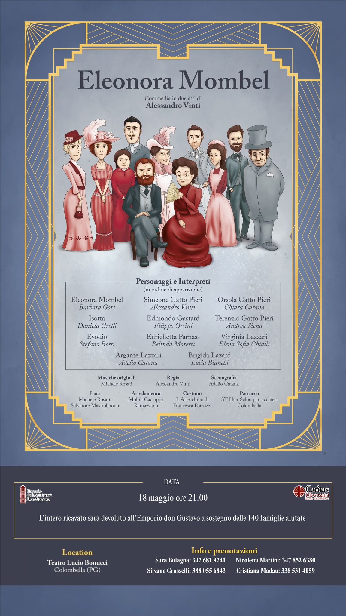 Domenica 18 maggio, alle 21, al Teatro Lucio Bonucci di Colombella, “Eleonora Mombel” commedia in due atti a cura degli “Amici del Teatro di Colombella”. Il ricavato sarà interamente devoluto all’Emporio della Solidarietà “Don Gustavo”.