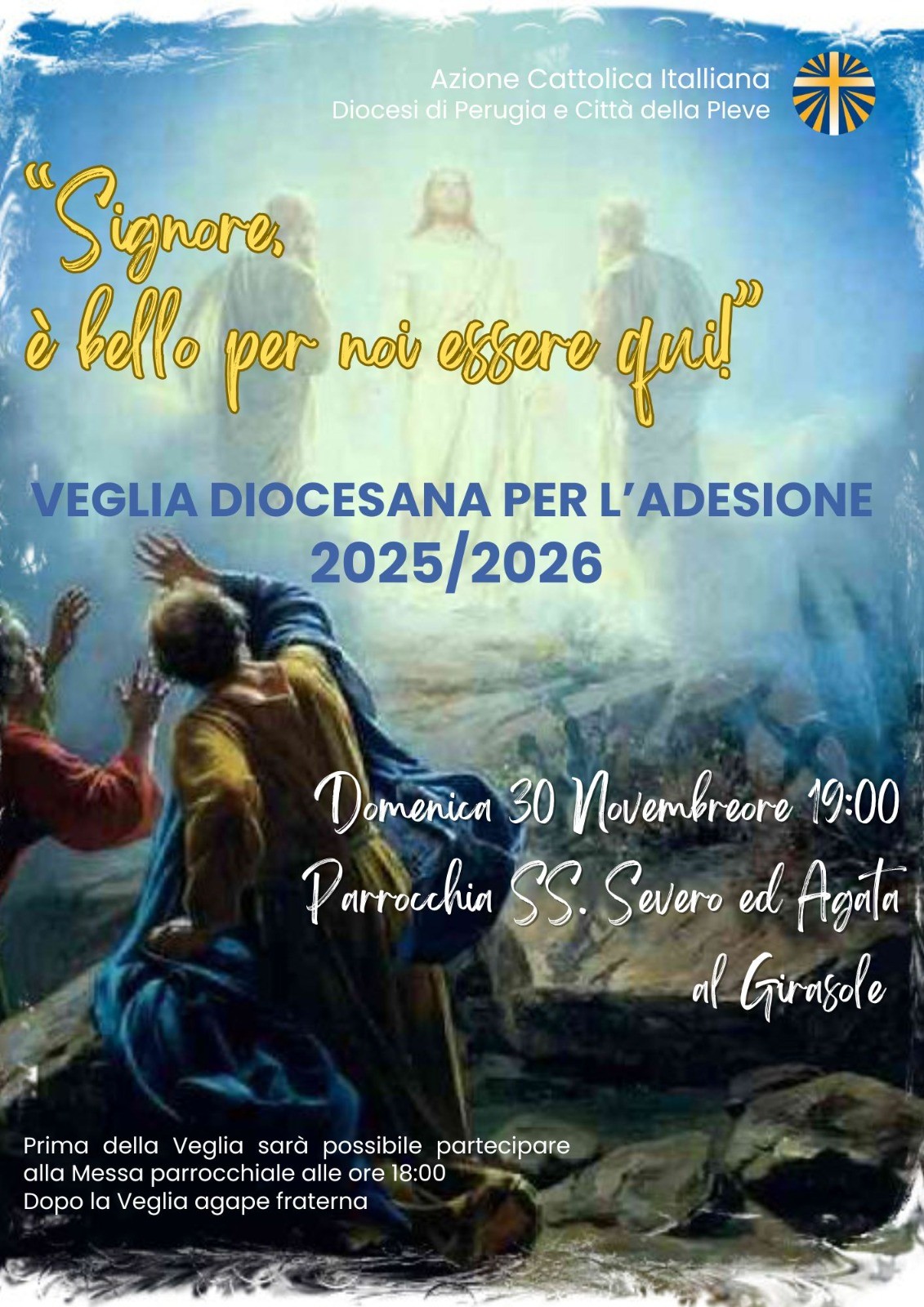 Domenica 30 novembre, alle 19, a Perugia, l’Azione Cattolica propone – presso la Parrocchia dei Santi Severo e Agata al Girasole – la Veglia di preghiera per l’Adesione.