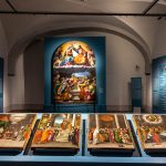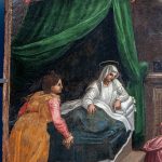 La seconda opera esposta è la Predella della Pala di Monteluce, costituita da quattro scomparti raffiguranti la Natività della Vergine, Presentazione di Maria al Tempio, Sposalizio della Vergine e Transito della Vergine, realizzati da Berto di Giovanni (documentato dal 1448 – Perugia, 1529). Le tavolette narrano alcuni episodi della vita di Maria, preludio alla scena finale raffigurata nella pala. Nel primo scomparto compare la data di esecuzione in numeri romani (MDXXV – 1525), dipinta sull’architrave di una porta da cui entra una donna con un bambino. Le scene sono caratterizzate da colori intensi, vivaci, saturi stesi con pennellate accurate e chiaroscurate nelle vesti e nei dettagli più minuti, capaci di restituire un’atmosfera di piena quotidianità, come in un album di famiglia. Attimi della vita di Maria che si svolgono in spazi interni, talvolta aperti, attraverso porte e finestre, su scorci di paesaggi che ampliano l’orizzonte narrativo e permettono l’ingresso di luce. I pannelli conservano sul retro alcuni incavi rettangolari, che fungevano da sede per delle cerniere in ferro. La loro presenza permette di ipotizzare che i due scomparti centrali si aprissero come sportelli, consentendo alle monache di assistere al momento culminante della messa: la consacrazione dell’eucaristia da parte del sacerdote.