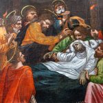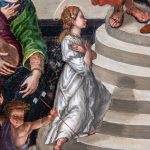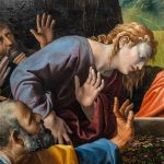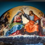 La terza opera esposta è l’Incoronazione della Vergine (detta Pala di Monteluce) realizzata da Raffaello Sanzio (Urbino, 1483 – Roma, 1520), Giulio Pippi, detto Giulio Romano (Roma, 1499 ? – Mantova, 1546) Giovan Francesco Penni detto il Fattore (Firenze, 1488 – Napoli, 1528). La pala è composta da due grandi tavole, come si nota da un taglio semicircolare che attraversa la nuvola. Una divisione materiale che si riflette nella composizione della scena in due registri, inferiore e superiore. La bottega di Raffaello rivela qui la sua altissima qualità: la monumentalità delle figure, la raffinatezza del disegno, l’intensità emotiva degli sguardi e la ricchezza cromatica, composta da calibrate armonie e contrasti sapienti, compongono una scena solenne e al tempo stesso vibrante di umanità. In alto, Maria è incoronata dal Figlio ed entrambi sono seduti sulle nuvole, attorniati da schiere angeliche sotto un cielo dorato che sfuma nei blu plumbei, aprendosi su un paesaggio lontano, forse allusione alla Valle di Giosafat. Sulla terra, gli apostoli accorrono attorno al sepolcro: al posto del corpo della Vergine sboccia una fioritura miracolosa, evocata dalle fonti antiche con l’immagine di un profumo intenso e soave. L’assunzione in cielo di Maria, in corpo e anima, lascia però sulla terra un segno tangibile di speranza: la tomba, simbolo della morte, diventa spazio di vita nuova. I gesti e gli sguardi di alcuni apostoli sono rivolti verso l’alto, in maniera così intensa che sembrano attraversare le nubi, intuendo la realizzazione di una promessa che, già germogliata sulla terra, trova compimento in cielo, là dove Maria li precede.