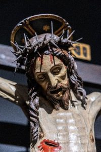 Questa specifica ricerca di un accentuato patetismo della forma caratterizza la vasta produzione di crocifissi lignei da parte di maestri tedeschi, attivi in Italia nella seconda metà del Quattrocento. Tra essi spicca la figura di Giovanni Teutonico, cui è stato riferito il Crocifisso qui esposto, proveniente secondo gli studi dal complesso di Santa Maria Assunta in Monteluce e attualmente custodito nel monastero di Sant’Erminio. Proprio la crudezza dei dettagli, difficilmente sostenibile dal nostro sguardo, attraeva magneticamente gli occhi delle monache nei lunghi momenti di preghiera, rivolti verso quell’Uomo appeso alla croce, segno vivo di una sofferenza intrisa d’amore incondizionato.