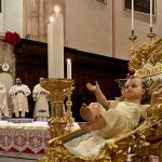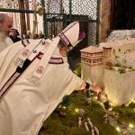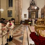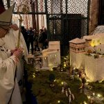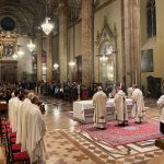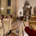 “Dove ci si accoglie e le relazioni sono custodite, Dio si fa presente, Dio torna a nascere. E con lui, torna ad accendersi la vita. La tua, la vita della famiglia, della comunità, della stessa società”. È il richiamo dell’arcivescovo Ivan Maffeis rivolto, nell’omelia della celebrazione della Notte di Natale, ai numerosi fedeli che gremivano le tre navate della cattedrale di San Lorenzo a Perugia. La celebrazione, animata dalla Corale Laurenziana, si è conclusa con la deposizione del bambinello nel presepe da parte dell’arcivescovo. Concelebranti sono stati il vicario generale don Simone Sorbaioli, l’arciprete don Fausto Sciurpa, il parroco don Marco Briziarelli insieme ai canonici con il cerimoniere liturgico don Francesco Verzini e i seminaristi. Tra i fedeli non pochi turisti che hanno scelto il capoluogo umbro come meta delle loro vacanze natalizie. Nell’augurare «Buon Natale a ciascuno, a tutti», monsignor Maffeis ha ricordato che «Nel mistero di questa Notte Santa, ciascuno di noi è qui per cercare un suo posto nel presepe. La notizia, che riempie di speranza, è che – attorno questo “bambino avvolto in fasce, adagiato in una mangiatoia” – questo posto c’è: per me, per te, per ciascuno».