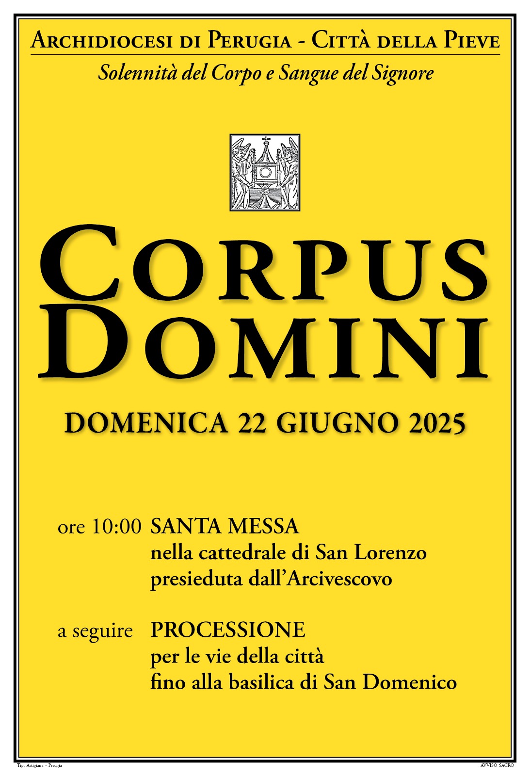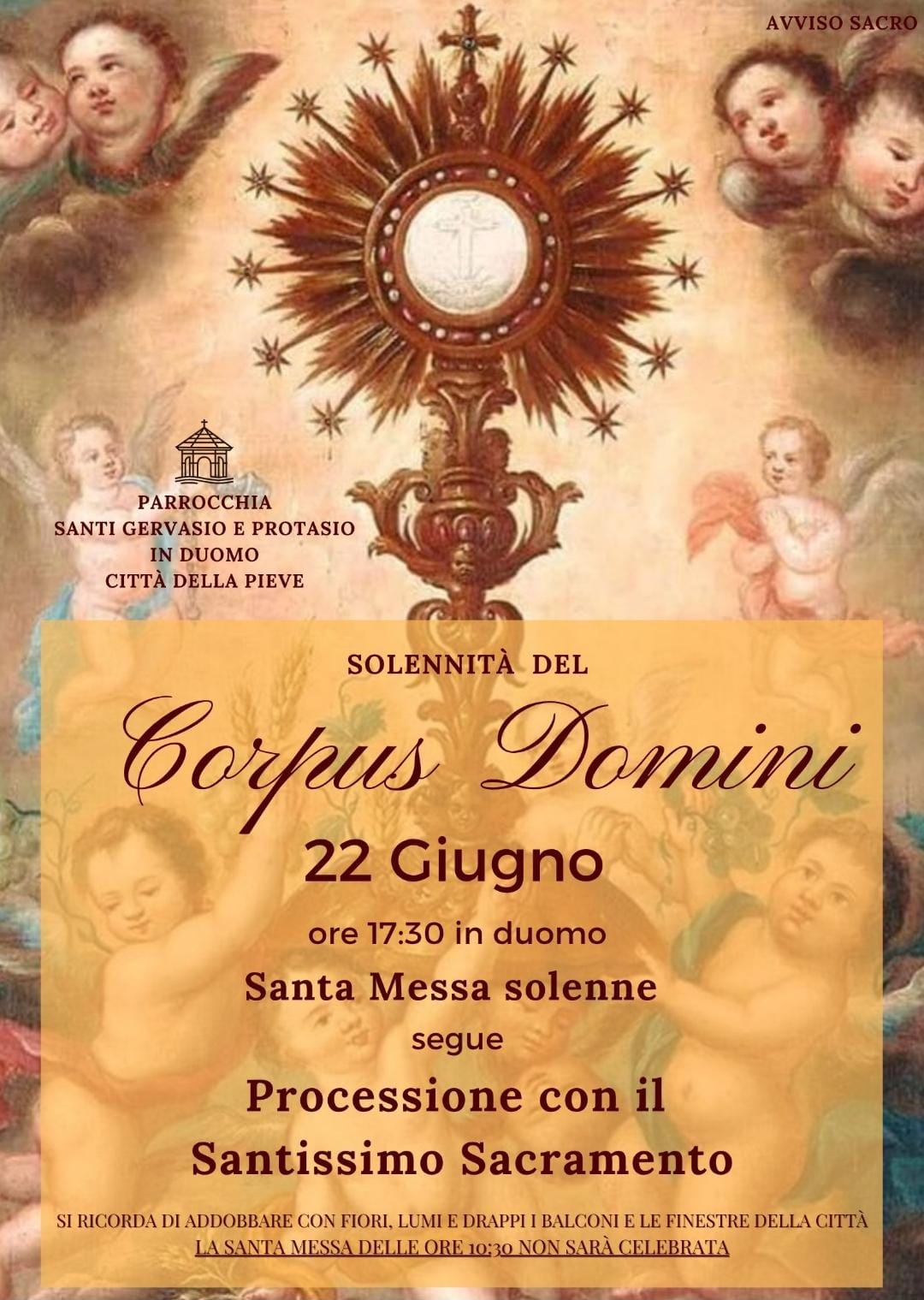 Domenica 22 giugno, Solennità del Corpus Domini. L’Arcivescovo presiede alle 10 la S. Messa nella Cattedrale di Perugia conclusa dalla processione e alle 17.30 a Città della Pieve.