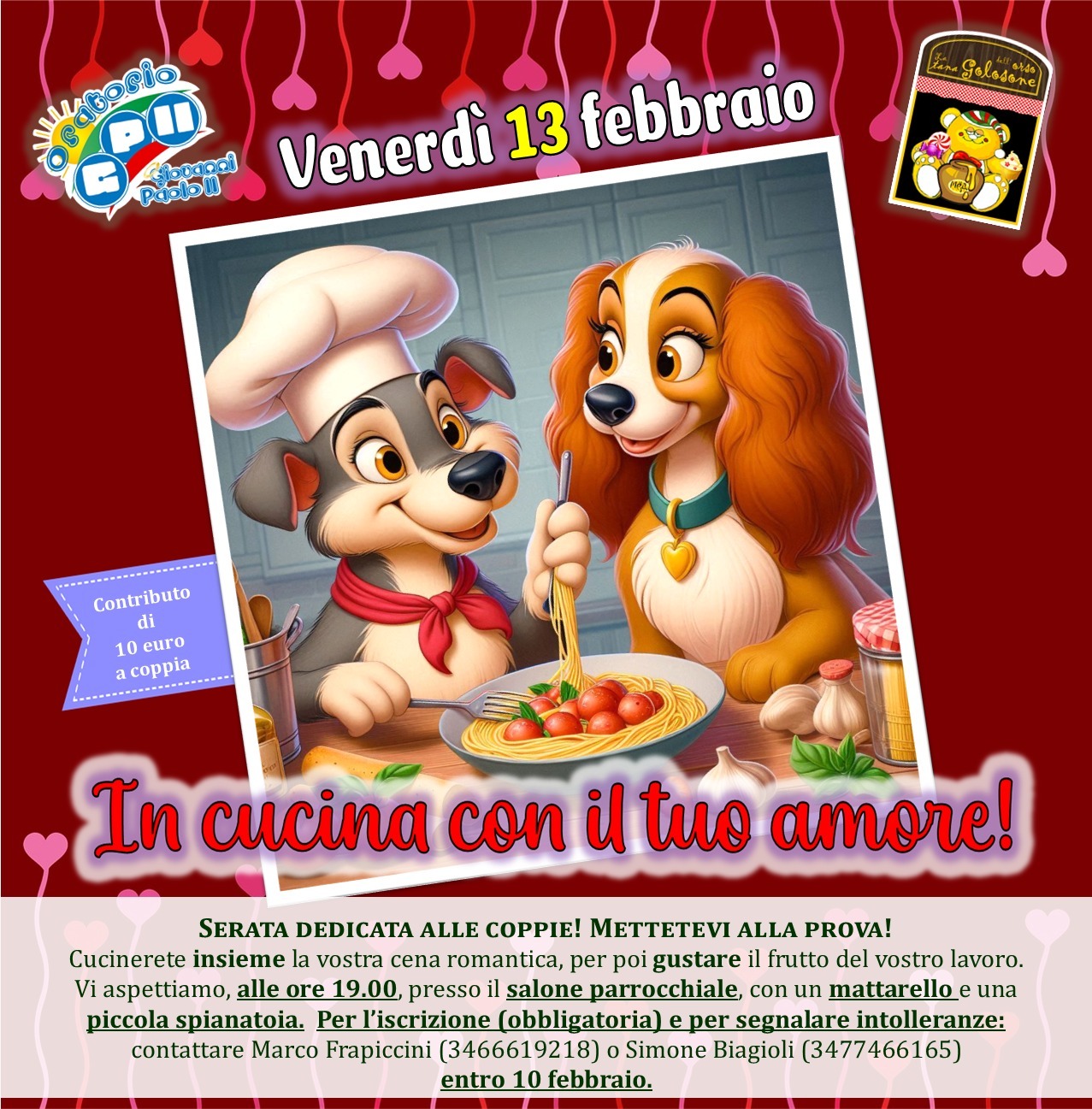 Il fine settimana di San Valentino si apre all’Oratorio GPII con una serata dedicata alle coppie. “In cucina con il tuo amore!” è la proposta del Laboratorio dell’Orso Golosone per venerdì 13 dalle 19 in poi nel salone parrocchiale per cucinare in coppia e concedersi una cena, frutto del lavoro condiviso.