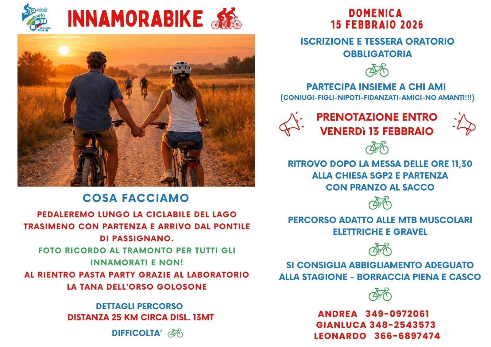 Per chi abbia piacere di trascorrere una giornata all’aria aperta in compagnia dei propri cari, l’appuntamento è per domenica 15 con “Innamorabike”. Partenza dopo la Messa delle 11.30; pranzo al sacco, bicicletta, abbigliamento adeguato e casco. Il percorso ad anello dal pontile di Passignano sul Trasimeno è di 25 chilometri con un dislivello minimo. La giornata si concluderà con un “pasta party” a cura del Laboratorio dell’Orso Golosone. Una bella occasione per giovani e adulti, famiglie, nonni e nipoti, per trascorrere una giornata di serena fraternità e amicizia.