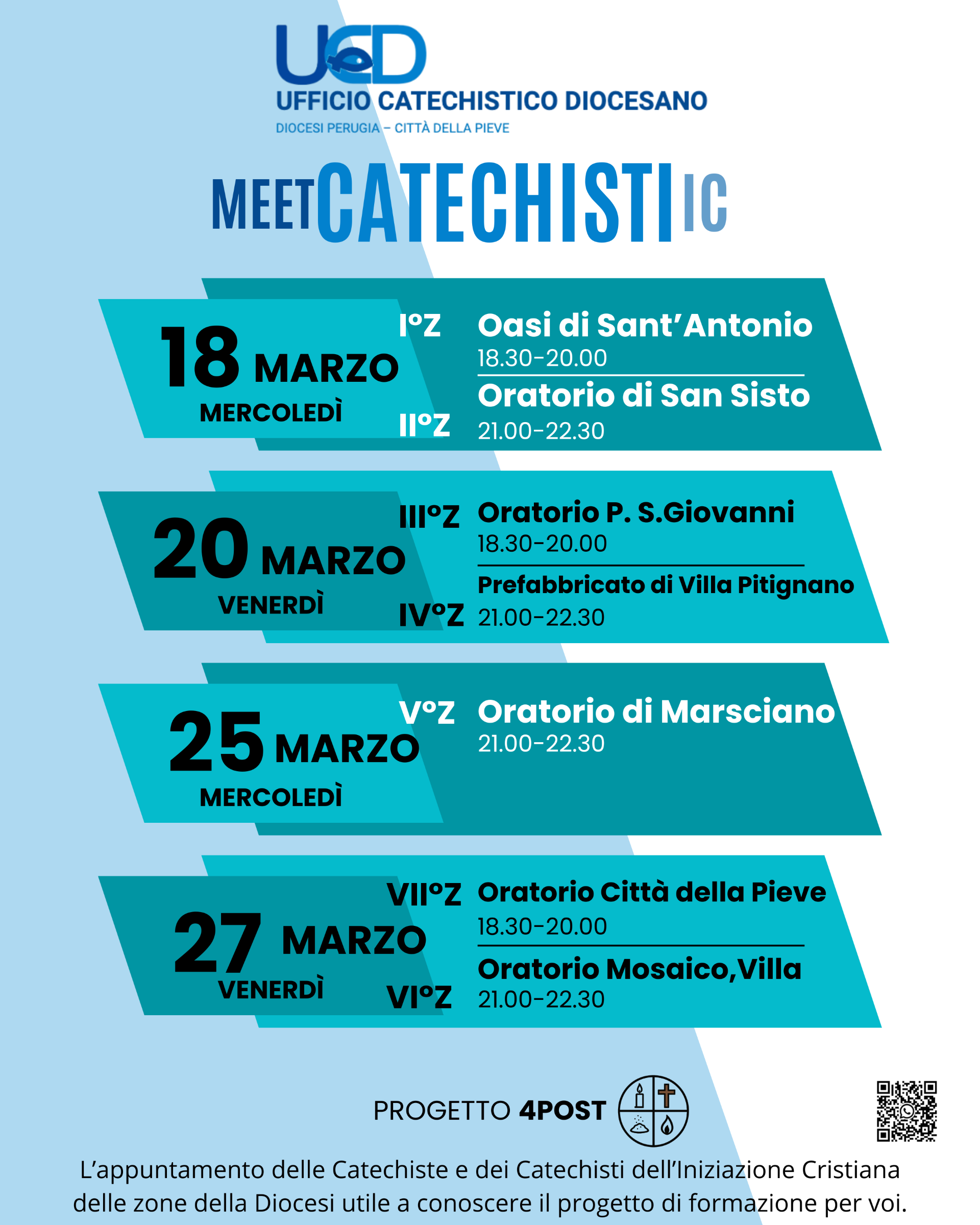 L’Ufficio Catechistico diocesano organizza per il mese di marzo, in tutte le sette zone pastorali, un incontro rivolto ai catechisti dell’iniziazione cristiana: un tempo dedicato all’ascolto ma anche a crescere insieme rafforzando relazioni, confronto e cammino comune.