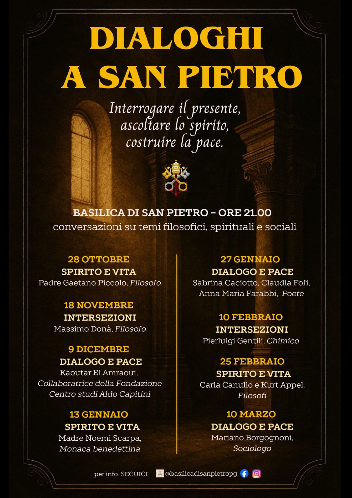 La basilica di San Pietro in Perugia inaugura un nuovo ciclo di incontri serali, dal titolo “Dialoghi a San Pietro”, pensato come uno spazio di confronto libero e profondo tra fede, cultura e vita concreta, con il significativo sottotitolo Filosofia, spiritualità e società in ascolto del presente.
