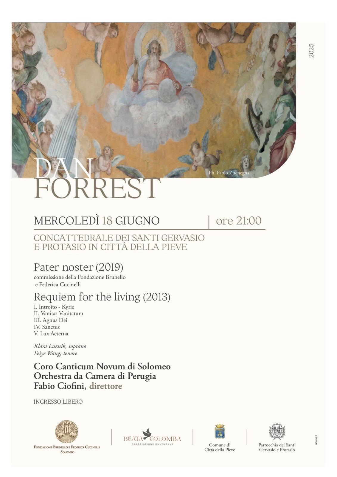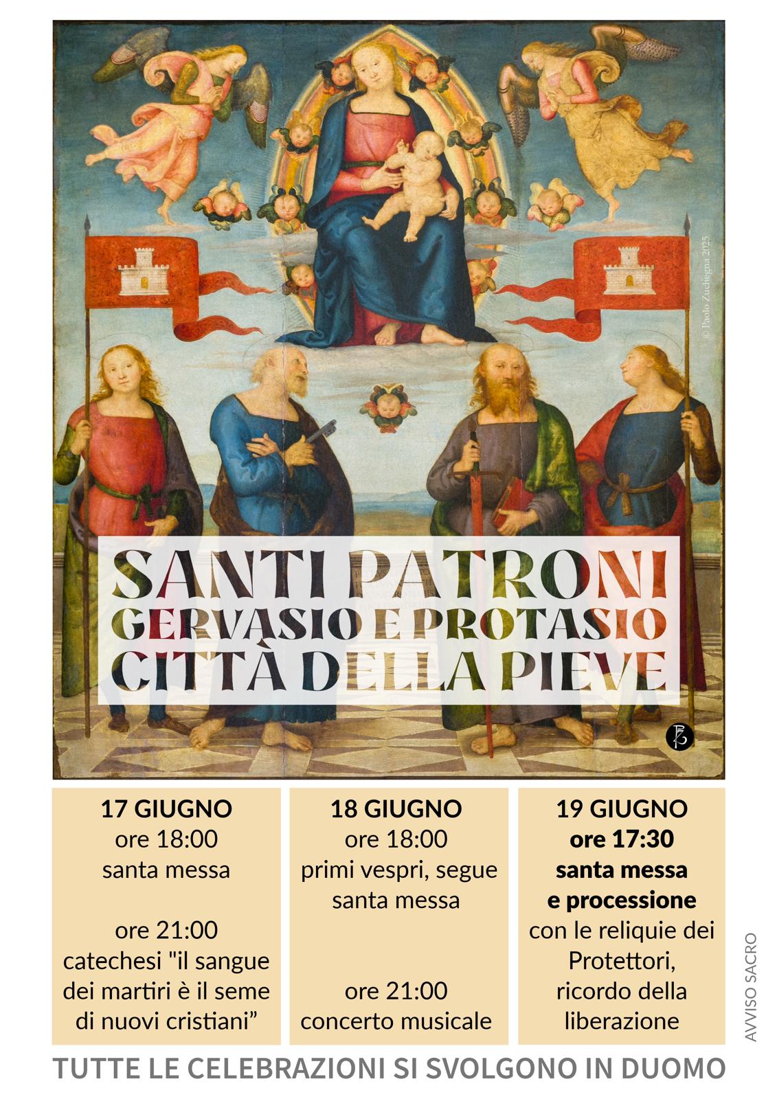 Il 18 giugno, alle 18.00, il capitolo dei canonici celebrerà i primi vespri dei santi Gervasio e Protasio. Alle 21.00, il coro Canticum Novum di Solomeo con l’Orchestra da Camera di Perugia, diretti dal maestro Fabio Ciofini, eseguiranno un concerto in onore dei Santi protettori.