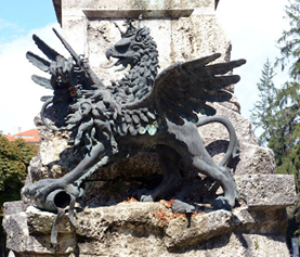 Il monumento nella sua interezza e particolare del Grifo che ghermisce il triregno dopo il restauro del 1980