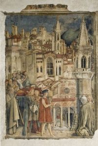 Sulla «passione cittadina» dedicata a questa decorazione si può leggere l’interessante e dettagliato saggio di Maria Rita Silvestrelli La città dipinta di Benedetto Bonfigli nella cappella del Palazzo dei Priori di Perugia (in Entre idéel et matériel: espace, territoire et légitimation du pouvoir…, Parigi 2018). Una visita a quegli affreschi, oggi inglobati in quella che lo stesso Chiaretti definiva «la sacra Galleria Nazionale dell’Umbria», immerge non solo nel clima quattrocentesco e nella città del tempo, ma anche, quasi al vivo, in quelle che dovettero essere le vicende rappresentate. Una vera “traslazione dello spirito”.
