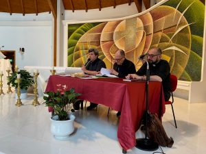 Assemblea diocesana 2025, i coordinatori dei lavori della plenaria, don Simone Pascarosa, mons. Ivan Maffeis e don Simone Sorbaioli f2