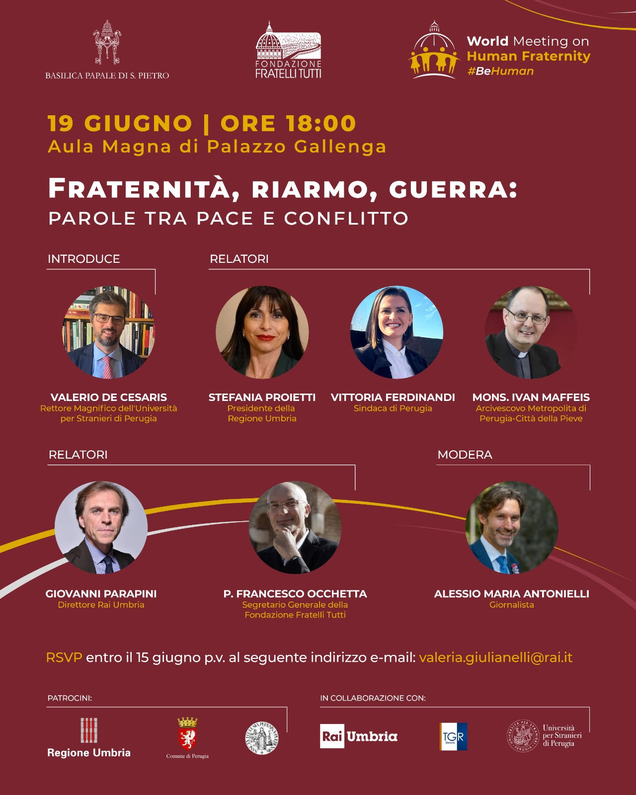 Intervengono: la Presidente della Regione Umbria Stefania Proietti; la Sindaca di Perugia Vittoria Ferdinandi, anche delegata dell’Anci per la Pace; l’Arcivescovo di Perugia e Città delle Pieve Ivan Maffeis; il direttore di Rai Umbria Giovanni Parapini; il Presidente Fondazione PerugiAssisi per la Cultura della Pace Flavio Lotti e il Segretario Generale della Fondazione Fratelli tutti e curatore del libro padre Francesco Occhetta.