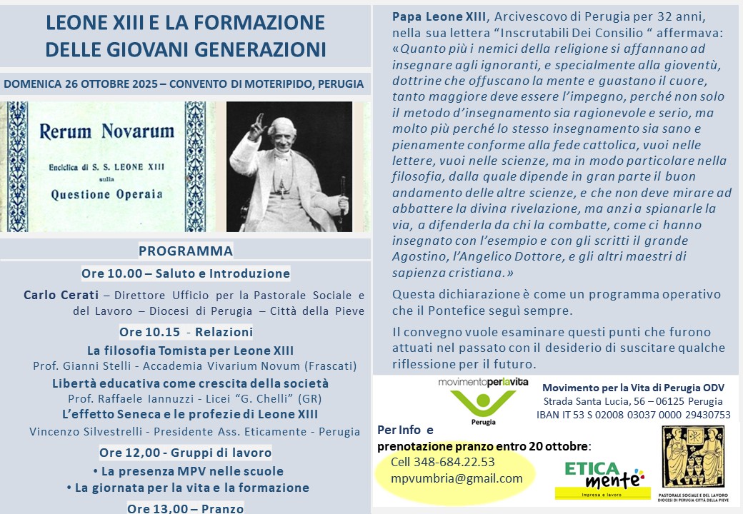 Domenica 26 ottobre, a Perugia, presso il convento di Monteripido, si svolge il convegno “Leone XIII e la formazione delle giovani generazioni”, promosso dall’Ufficio diocesano per la Pastorale Sociale e del Lavoro, dal Movimento per la Vita di Perugia ODV e dall’associazione Eticamente.