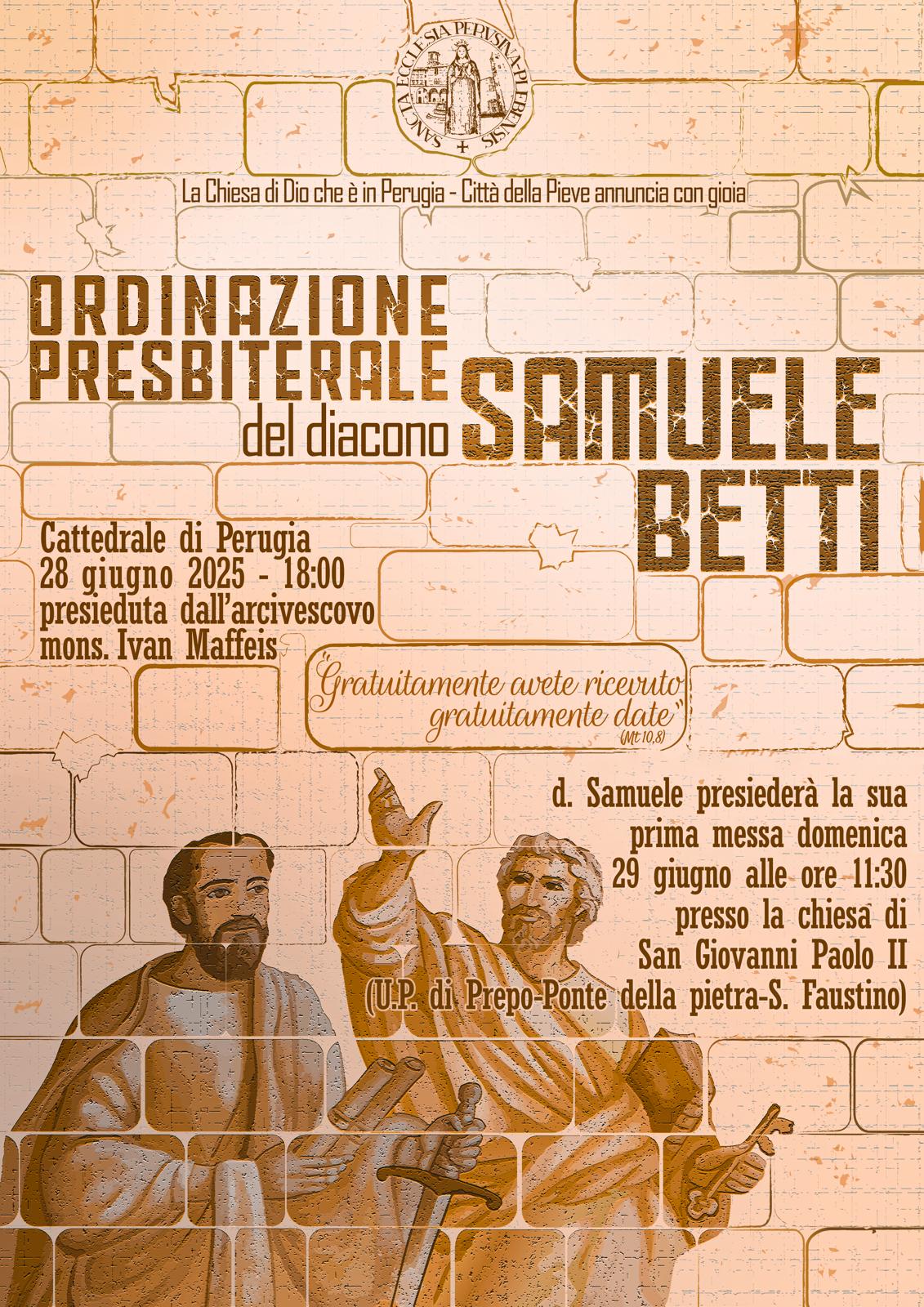 Il novello sacerdote celebrerà la Prima Messa domenica 29 giugno, alle 11.30, presso la chiesa dedicata a San Giovanni Paolo II nell’Unità pastorale di Prepo – Ponte della Pietra.
