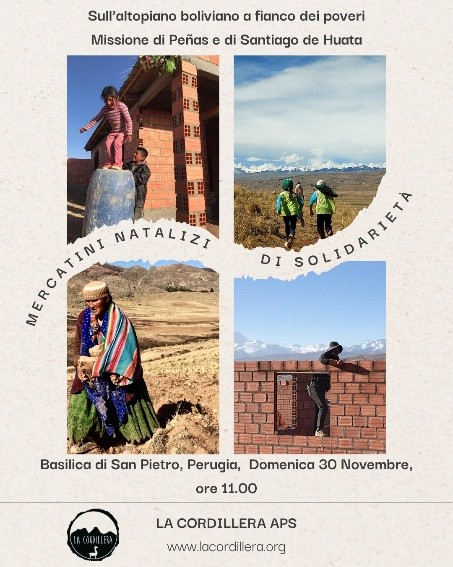 - Domenica 30 novembre, alle 11.00, alla Basilica di San Pietro, mercatino di solidarietà al termine della S. Messa per le comunità di Penas e Santiago di Huata in Bolivia, dove i due giovani missionari, Bernardo e Petra, stanno per dirigersi.