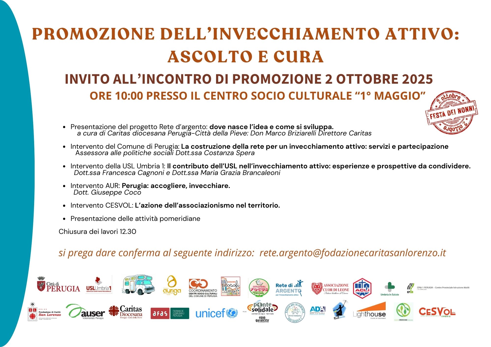 La mattinata avrà inizio alle ore 10.30 e si pone come obiettivo quello di promuovere un incontro di sensibilizzazione del territorio sull’invecchiamento attivo con la partecipazione dei partner del pubblico e del privato sociale. La chiusura dei lavori è prevista per le ore 12.30. Parteciperanno all’evento: Dott.ssa Costanza Spera assessora alle politiche sociali, Don Marco Briziarelli, Direttore della Caritas diocesana, Dott.ssa Francesca Cagnoni e Dott.ssa Maria Grazia Brancaleoni della USL Umbria 1, Dott. Giuseppe Coco di AUR Perugia e i rappresentanti di CESVOL.