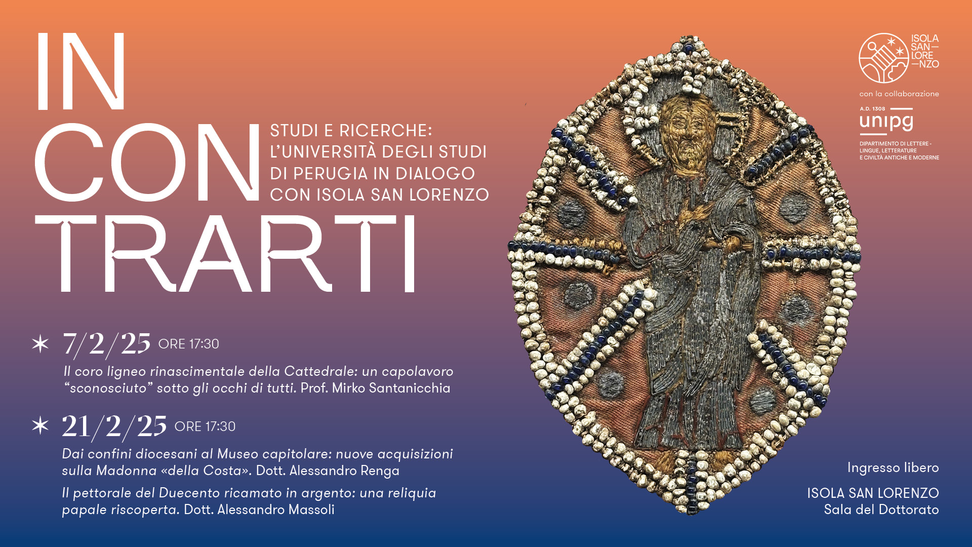 A partire dal mese di febbraio, il complesso monumentale aprirà le sue porte al pubblico per una serie di incontri con studenti e docenti dell’Università di Perugia. L’iniziativa, dal titolo “Incontrarti. Studi e ricerche: l’Università degli Studi di Perugia in dialogo con Isola San Lorenzo”, ha l’obiettivo di rinnovare il proficuo dialogo tra l’istituzione museale e quella universitaria, che già in passato ha condotto a scoperte e acquisizioni, al fine di ampliare e condividere una ancor più profonda conoscenza del cospicuo patrimonio storico-artistico del complesso capitolare.