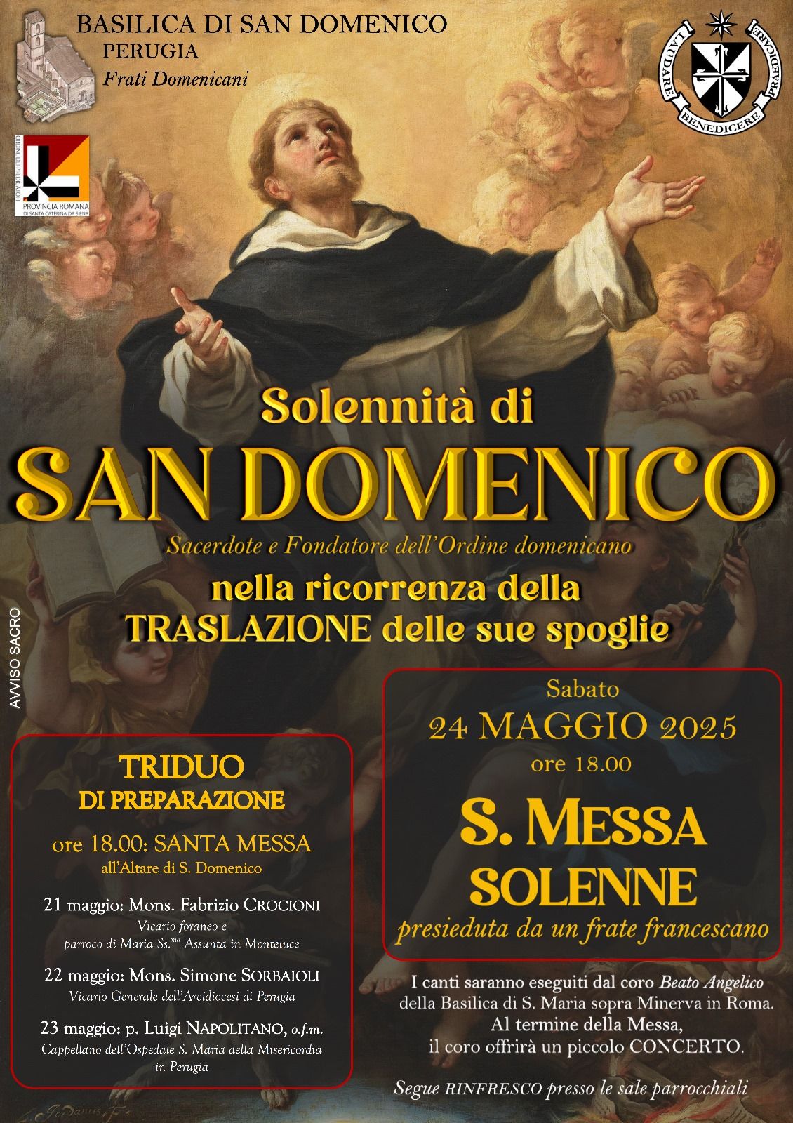Nella Basilica di S. Domenico in Perugia, per la ricorrenza della traslazione delle spoglie di S. Domenico, sacerdote e fondatore dell’Ordine domenicano, dal 21 al 24 maggio triduo e S. Messa solenne.