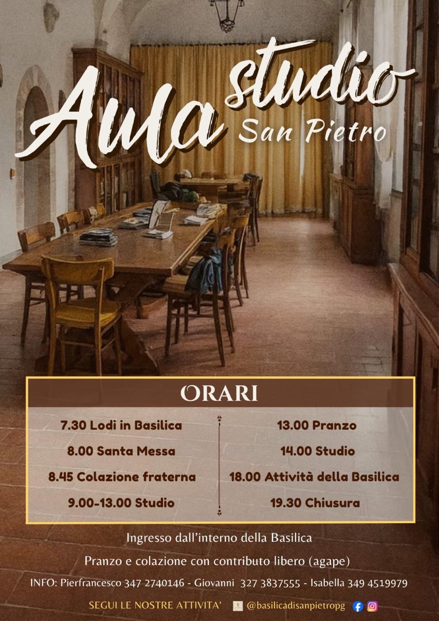 “Aula Studio San Pietro” è il nome di uno spazio silenzioso e attivo offerto a Perugia nel cuore antico della basilica, pensato per chi cerca concentrazione e un ritmo di studio sostenibile.