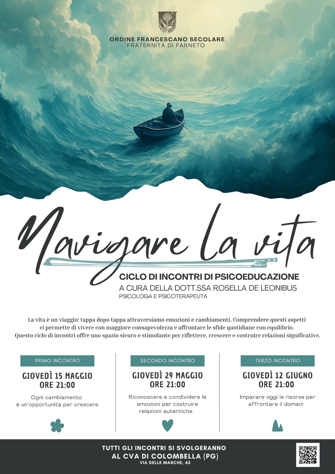 La Fraternità di Farneto dell’Ordine Francescano Secolare promuove, insieme con la Parrocchia, un ciclo di tre incontri di psico-educazione il giovedì alle 21 presso il CVA di Colombella.