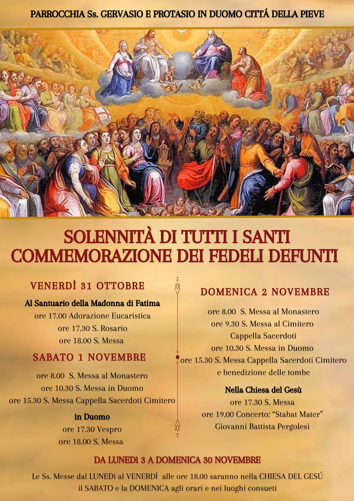 Gli orari delle celebrazioni a Città della Pieve in occasione della Solennità di Tutti i Santi e della Commemorazione dei fedeli defunti.