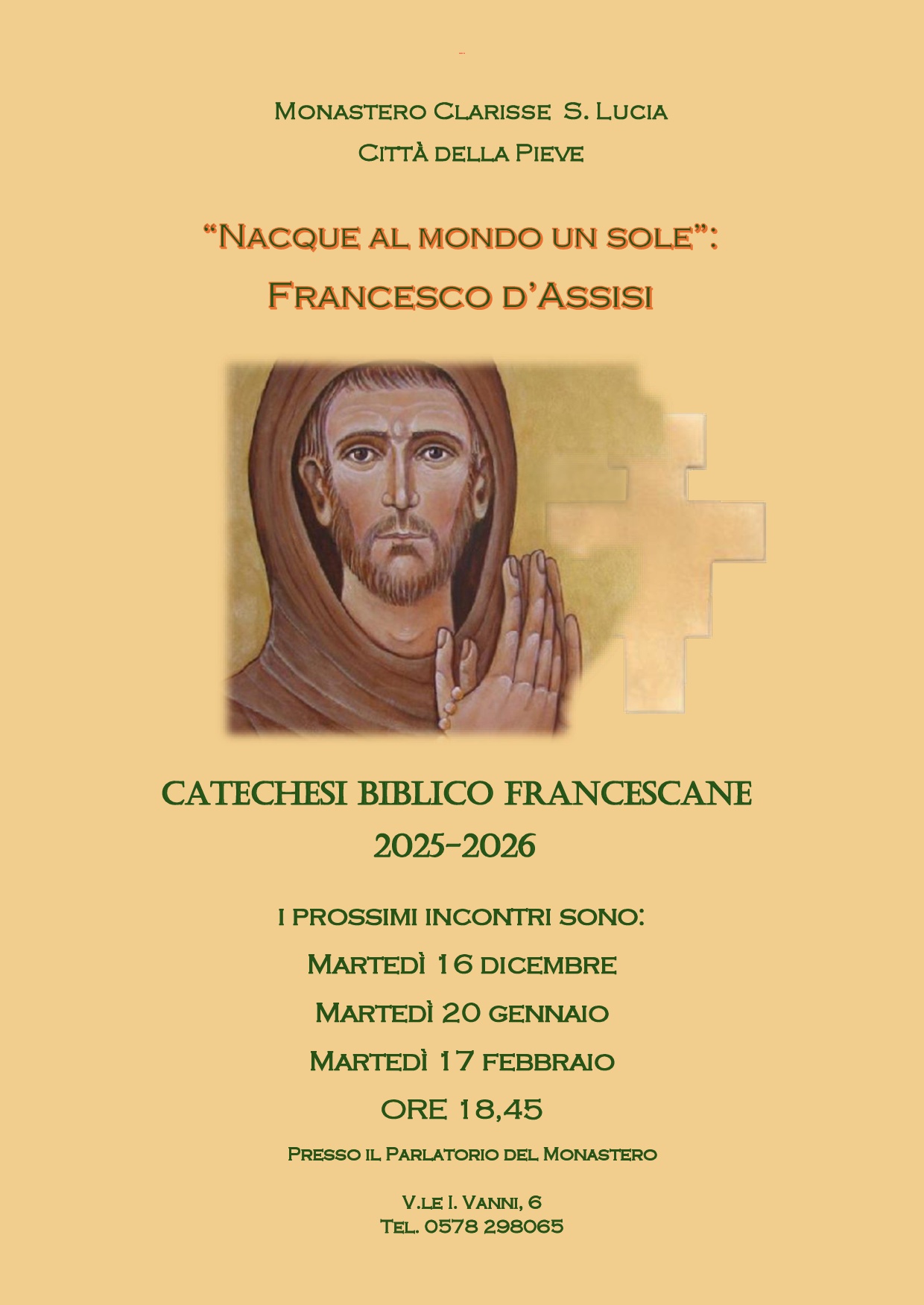 Al parlatorio del Monastero delle Clarisse di Santa Lucia (v.le Vanni, 6 – Città della Pieve), da martedì 14 ottobre alle 18.45, è iniziato il ciclo di catechesi biblico-francescane dal titolo “Nacque al mondo un sole”.