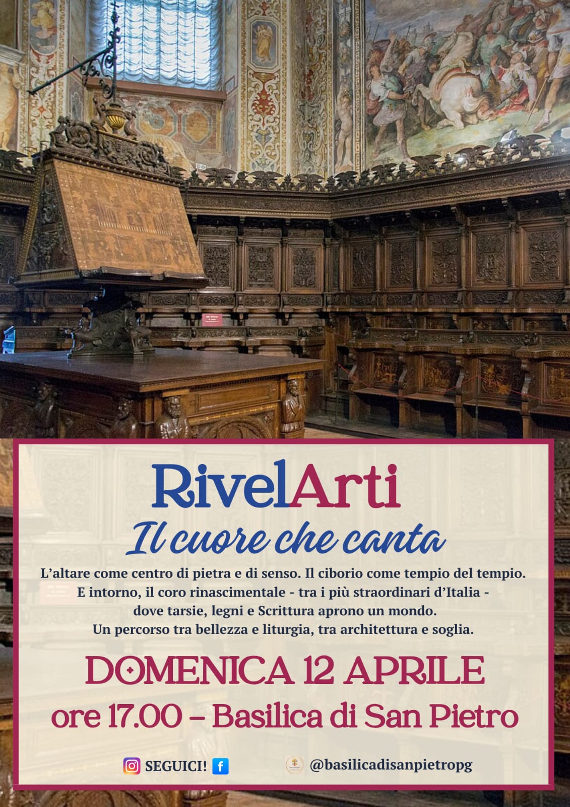 È stato intitolato RivelarTi, con un gioco di parole dal significato facilmente intuibile, il ricco cartellone di un percorso illustrato tra le meraviglie della Basilica di San Pietro in Perugia, dal 12 ottobre al 10 maggio 2026, una domenica al mese, con inizio alle cinque del pomeriggio.